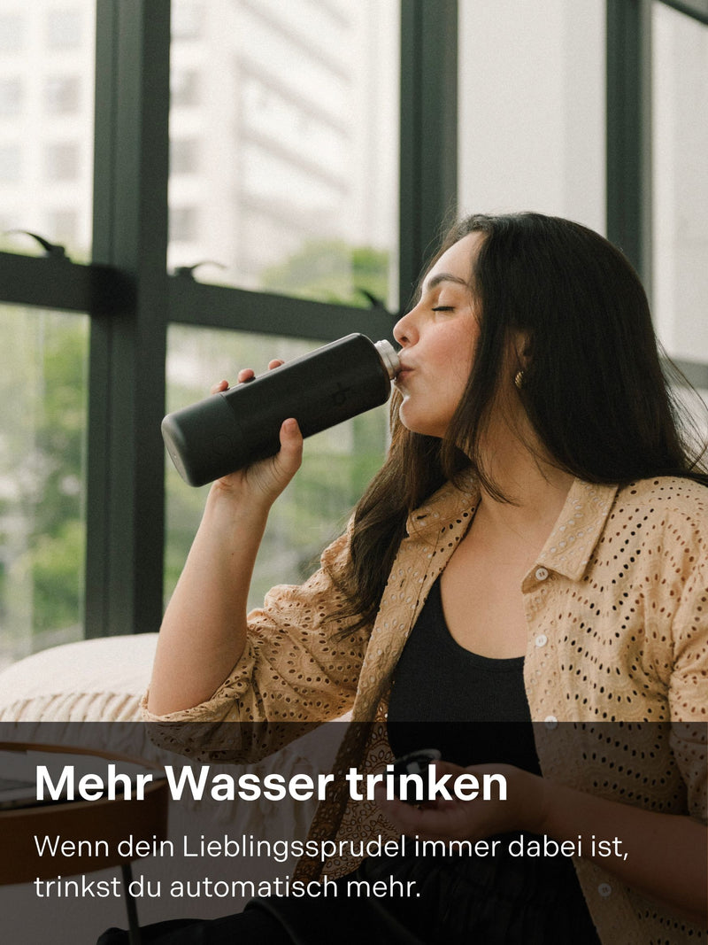 Dank integriertem Carboniser kannst du das Wasser in deiner Flasche unterwegs gleich selbst sprudeln. Ein voller Carboniser reicht fĂŒr bis zu 10 Flaschen (Ă  0.6 Liter) Sprudel. Ist der Carboniser leer, einfach zu Hause an der AuffĂŒllstation aufladen.