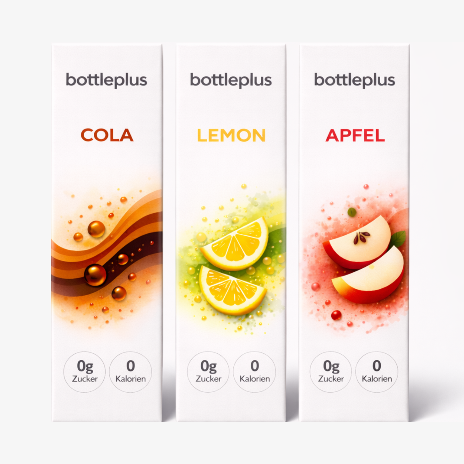 Drei Geschmacksrichtungen: Apfel, Cola und Lemon-Lime. Ideal, um unsere Geschmackslösung kennenzulernen oder deine Lieblingssorte zu finden.